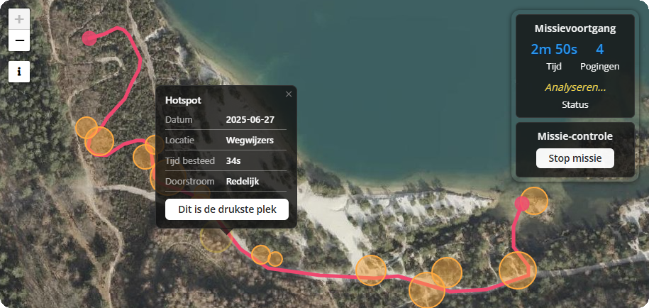 Welkom! Verschillende locaties langs een route lichten op als potentiële hotspots. Analyseer de visuele aanwijzingen en klik op de locaties om deze te verkennen.